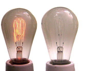 Carbon filament lamp (E27 socket, 220 volts, approx. 30 watts, left side: running with 100 volts)