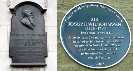 Public plaque commemorating Swan as the inventor of the incandescent electric light bulb, located in Newcastle upon Tyne, where Swan first demonstrated his bulb in 1878.