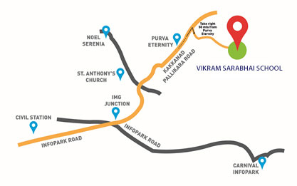 Away from the distractions of city life but well within the city, on the Thengode hilltop, the Vikram Sarabhai School is a lush green ten acre property filled with flower & fruit trees, overlooking the Info Park towards the south. The location is in one of the fastest growing suburbs in Kerala, with easy accessibility to air, rail and road terminals.